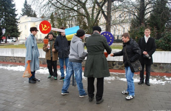Молодь Луцька вийшла на Театральний майдан, аби з’ясувати, що більше подобається лучанам: Євросоюз чи СРСР. Кажуть, захід організували через вибори в Російській Федерації