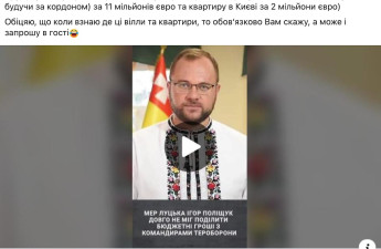 У TikTok зʼявилося відео, в якому міському голові Луцька Ігорю Поліщуку приписали купівлю розкішної квартири в Києві з каміном і міні-водоспадом за 2 млн євро та віллу в грецькому Фарангасі з басейном і будинком для прислуги за 11 млн євро.