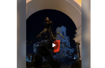 У Луцьку очевидці зняли на телефон відео, як хлопець заліз на браму Свято-Троїцького собору. Трохи повисівши на ній, він не втримався, впав і зламав ногу.