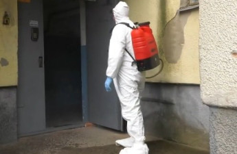 У захисних костюмах та зі спеціальним обладнанням: у Луцьку дезінфікують під’їзди багатоповерхівок.