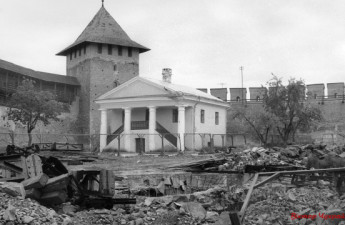 Розвалини церкви Івана Богослова на території Луцького замку у 1990 році, купи будівельного сміття та грунту показав фотограф Віктор Чухрай....
