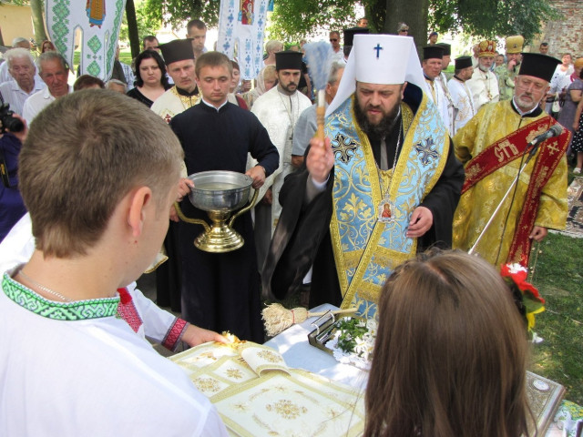 За водосвятним молебнем та чином освячення з владикою співслужили: міський декан протоієрей Юрій Пилипець, районний – протоієрей Євген Шевчук, настоятель парафії протоієрей Євген Рябець, духовенство місцеве і з Нововолинського деканату, а також священики з Львівської єпархії, які прибули разом із вірянами-паломниками. У молитві взяли участь священик Римсько-Католицької Церкви, заступник міського голови, секретар міськради Олег Свідерський.