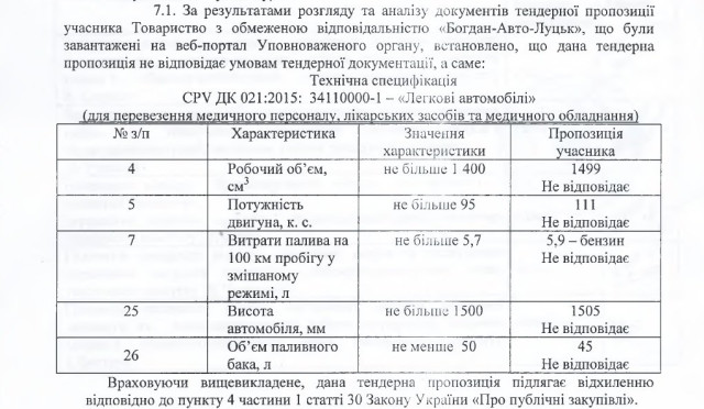 «У нас є автомобілі, в кількості 23 одиниці, які є нові (не були у використанні), виробництва 2018 року, належним чином зареєстровані в Україні та відповідають вимогам тендерної документації. З метою розширення можливого кола учасників і для можливості надання найкращої цінової пропозиції, просимо Вас внести зміни до тендерної документації для процедури закупівлі», - писав потенційний учасник торгів.Так, пропонували викласти пункт додатку до тендерної документації щодо об’єму паливного баку в редакції «не менше 45 літрів» замість «не менше 50 літрів». Однак організатор відмовився вносити пропоновану зміну, мотивуючи це тим, що «зазначена технічна характеристика об’єму паливного бака (л) - «не менше 50» наявна в легкових автомобілях як мінімум трьох різних виробників, які представлені на ринку України. Тендерним комітетом на засіданні 01 жовтня 2018 року вирішено, що необхідності внесення змін немає».