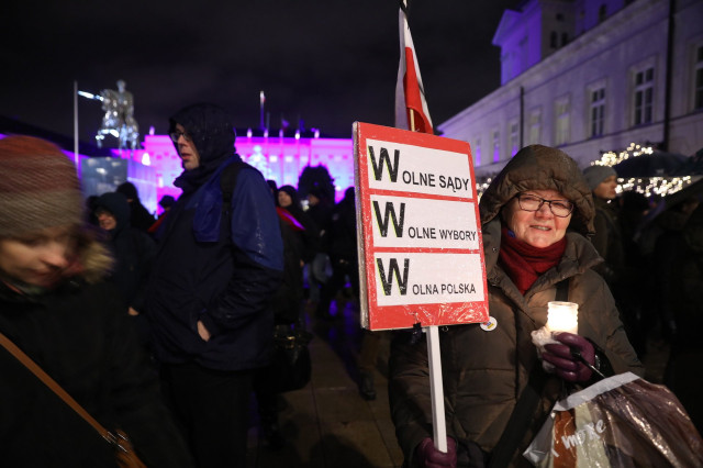 «Реформа системи правосуддя Польщі вкрай необхідна. Нам потрібна відкритість і чесність у діалозі між Варшавою та Європейською комісією. Я вірю в те, що суб’єктивне бачення Польщі може відповідати ідеї об’єднаної Європи».15 грудня поляки вийшли на демонстрацію «Все світло президенту», під час якої висловили протест проти судової реформи. Фото: EPA-EFE/Rafal Guz POLAND OUT