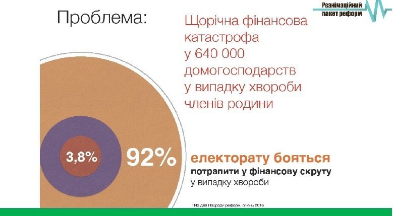 Як зауважує меденджер групи медична реформа Реанімаційного пакету реформ, кандидат медичних наук Олександр Ябчанка, згідно зі статистичними даними, понад 50 мільярдів гривень – частина держбюджету, яка йде на забезпечення системи охорони здоров’я. Приблизно стільки ж коштів українцям доводиться платити з власної кишені і вкладати в цю ж саму систему лише у вигляді медикаментів (понад 90% медикаментів українці купують з власної кишені). Окрім цього, неможливо точно підрахувати такий показник, як «неформальна подяка лікареві». Отже, грошей на повноцінне забезпечення системи охорони здоров’я держава не має.