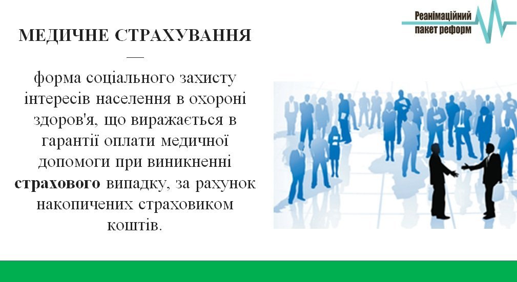 Цей процес називатиметься державним медичним страхуванням. Впровадження цієї моделі не потребуватиме додаткових видатків. Це не призведе до підвищення податків, оскільки кошти братимуть з загального бюджету, який зараз передбачений на утримання системи охорони здоров’я.