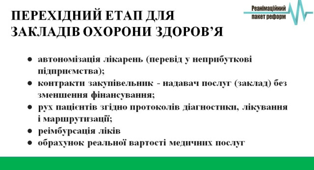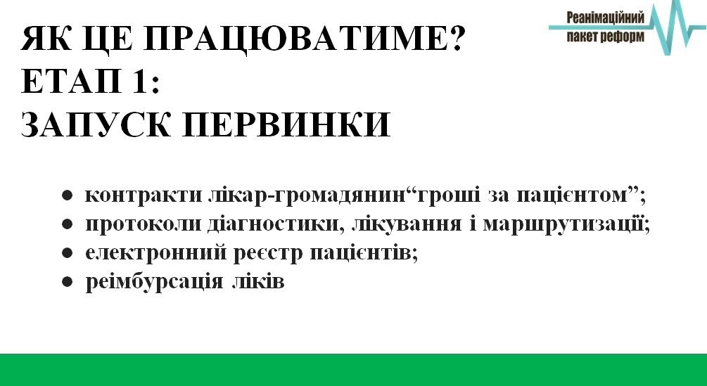 Так, держава повинна розпочати закуповувати пакет медичної допомоги в надавачів медичних послуг, які повинні почати конкурувати за пацієнта. Цей процес стартує у 2017 році з первинної ланки, тому що саме «первинка» відповідає за профілактику та ранню діагностику. На цьому рівні запустити в дію принцип «гроші ходять за пацієнтом» більш реально.