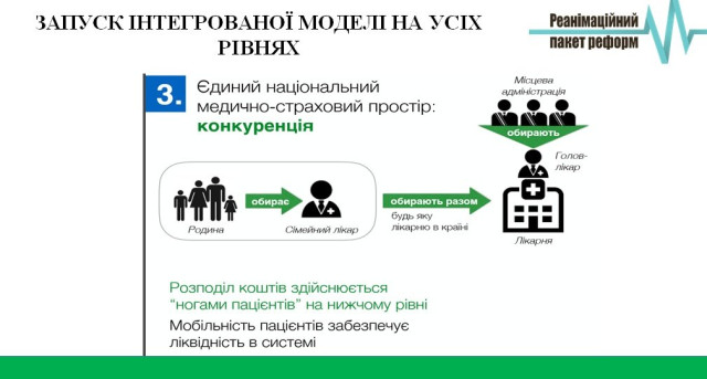 Родина обиратиме лікаря або лікарів «первинки» (педіатра, терапевта або сімейного лікаря), з яким укладатиме контракт. На цьому рівні відбуватиметься розподіл коштів за принципом «гроші ходять за пацієнтом» - від кількості контрактів залежатиме обсяг державних коштів. Якщо пацієнту потрібна складніша діагностика, лікар відправлятиме його у лікарню (не адміністративно-командним способом, а рекомендуватиме медичний заклад, рішення про те, в яку лікарню звернутися, ухвалює пацієнт і за ним йдуть бюджетні кошти). Вся ця інформація перебуватиме в єдиному реєстрі пацієнтів у електронному вигляді. Таким чином, розподіл коштів здійснюватиме не якийсь чиновник – розподіл фактично залежатиме від самого пацієнта.