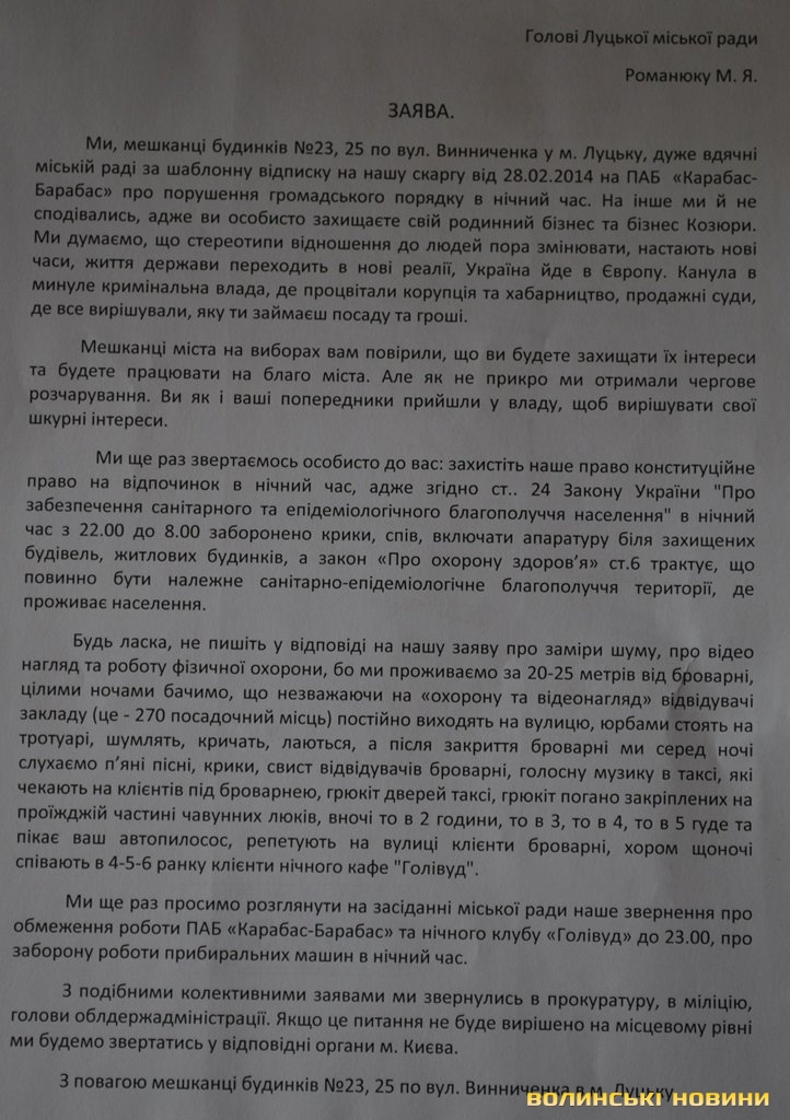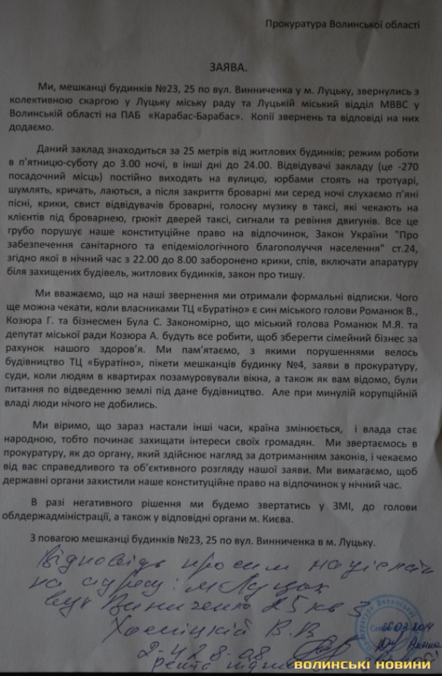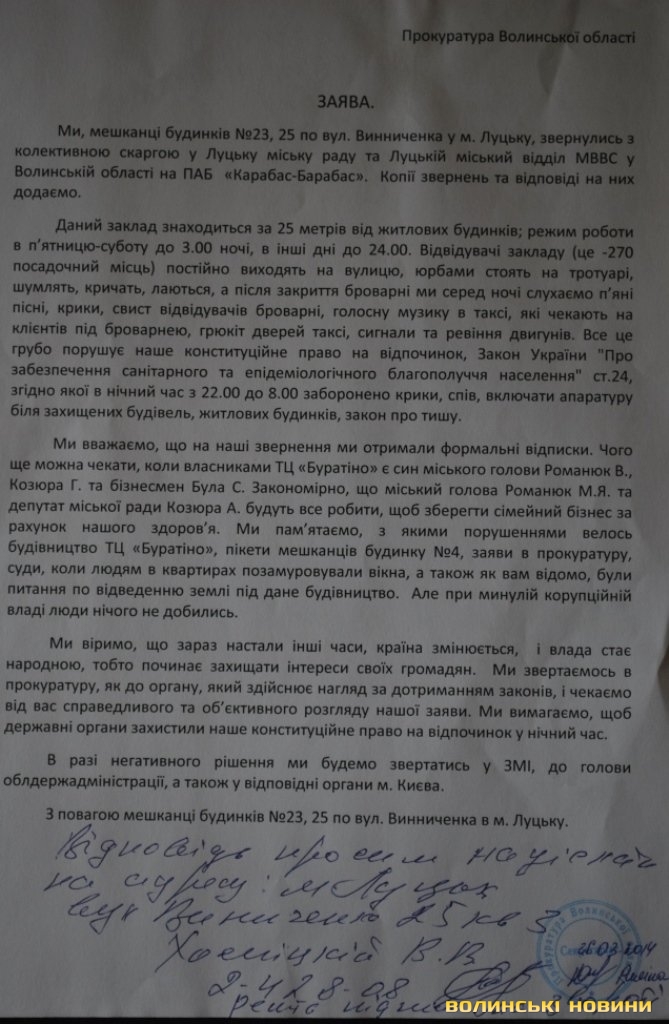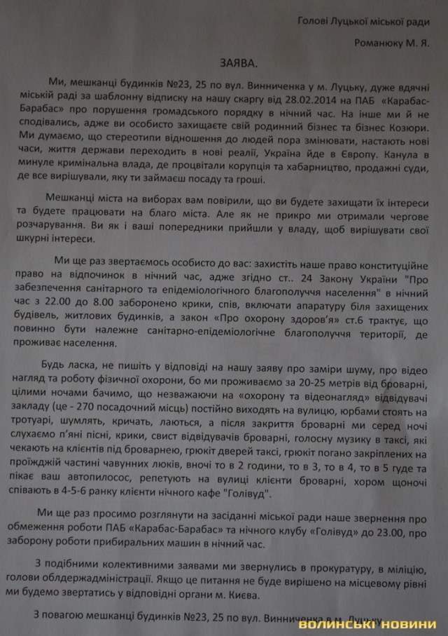 Мешканці вулиці Винниченка у Луцьку чимало натерпілися від впливових людей міста, зокрема у судах воювали щодо незаконного будівництва ТЦ «Буратіно», а зараз, пожинаючи плоди успішного бізнесу, не можуть нормально відпочивати вночі. Під вікнами людей працює броварня «Карабас Барабас», де до ранку розважаються молодики на підпитку.