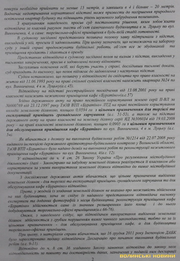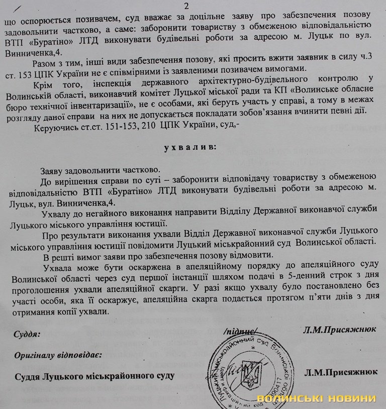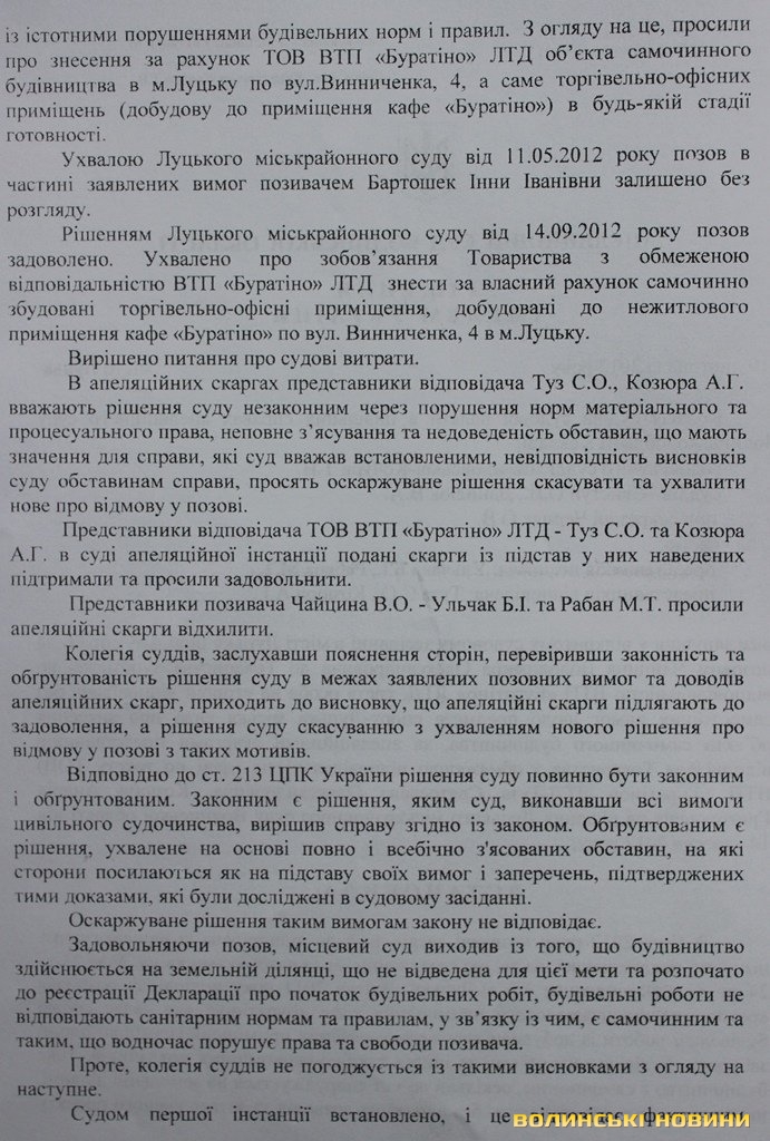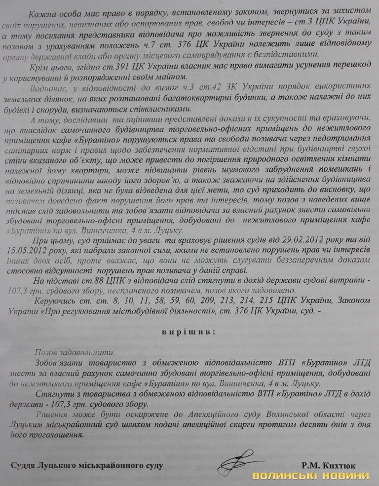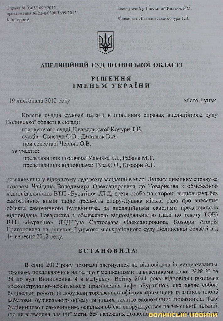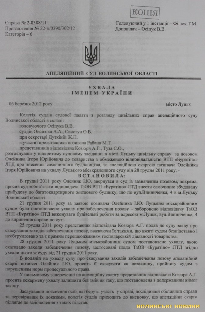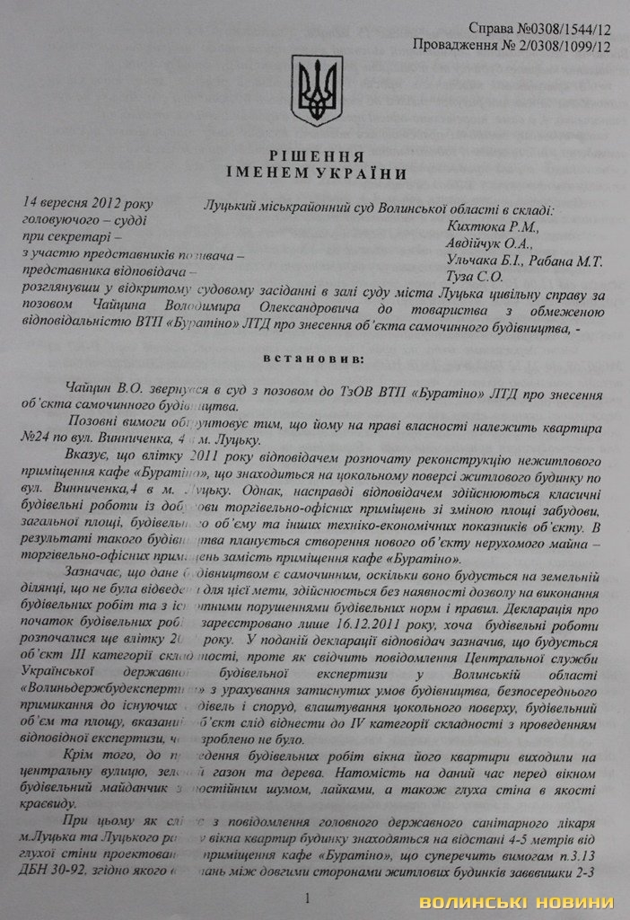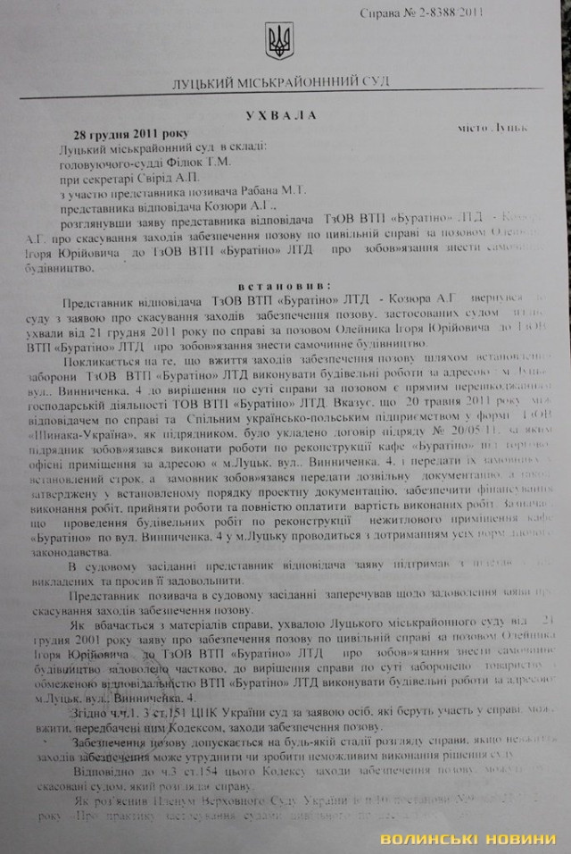 Перша ластівка перемоги у«війні» з мажорами опинилася на боку мешканців. Так, Луцький міськрайонний суд Волинської області 21 грудня 2011-го року за участю головуючого судді Присяжнюка Л.М. постановив призупинити будівництво «Буратіно», допоки справа не буде досліджена.Однак один із співініціаторів бізнесу Андрій Козюра одразу звернувся в суд, аби оскаржити таке рішення. Відповідь не довелося довго чекати: уже 28-го грудня Луцький міжрайонний суд за участю головуючого судді Філюк Т.М. вирішив скасувати попереднє рішення суду.Натомість мешканці будинку Винниченка, 4 знову почали шукати правди у суді, цього разу - в апеляційному. Феміда стала на бік мешканців й Ухвала іменем України від 06 березня 2012-го року задовольнила їх скаргу.Потому лучани підняли питання про знесення об’єкта самочинного будівництва. Як наслідок, Луцький міськрайонний суд за участю головуючого судді Кихтюка Р.М. 14-го вересня вирішив зобов’язати бізнесменів за власний рахунок знести самочинно збудовані приміщення, добудовані до нежитлового приміщення кафе «Буратіно».Втім, попри усі ухвали, торговий центр продовжували будувати, а Андрій Козюра, не бажаючи припиняти бізне, звернувся зі скаргою в Апеляційний суд Волинської області. Цього разу феміда підтримала бізнесмена й скасувала попередні «неприємні» рішення, остаточно ставши на бік підприємців.