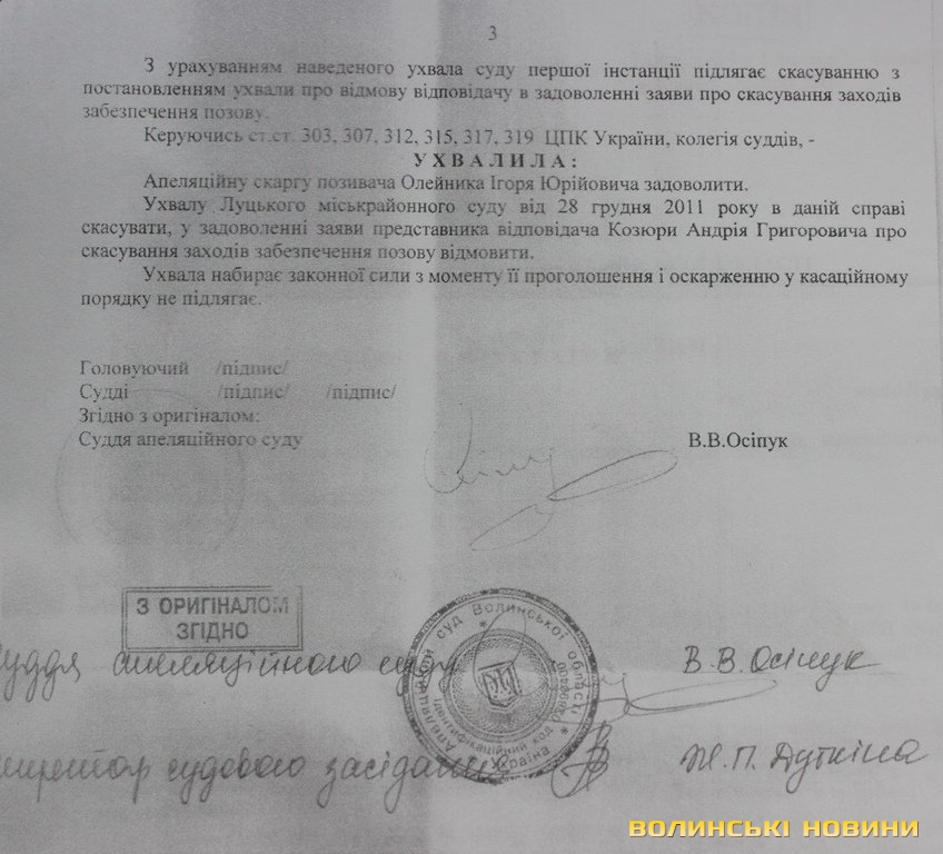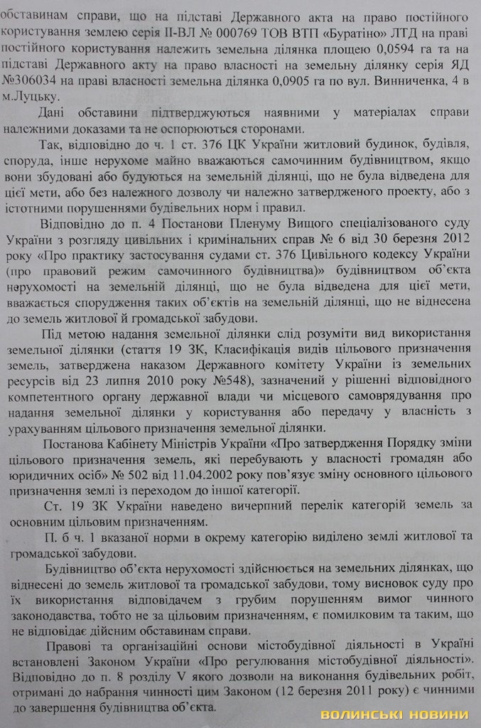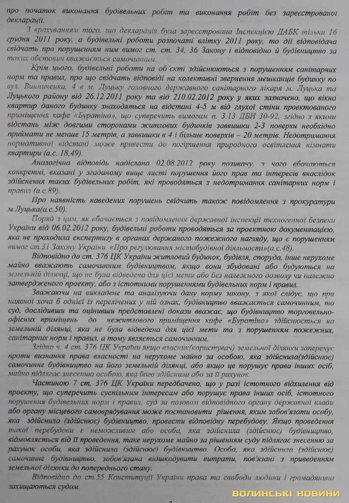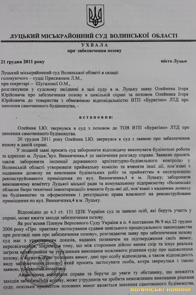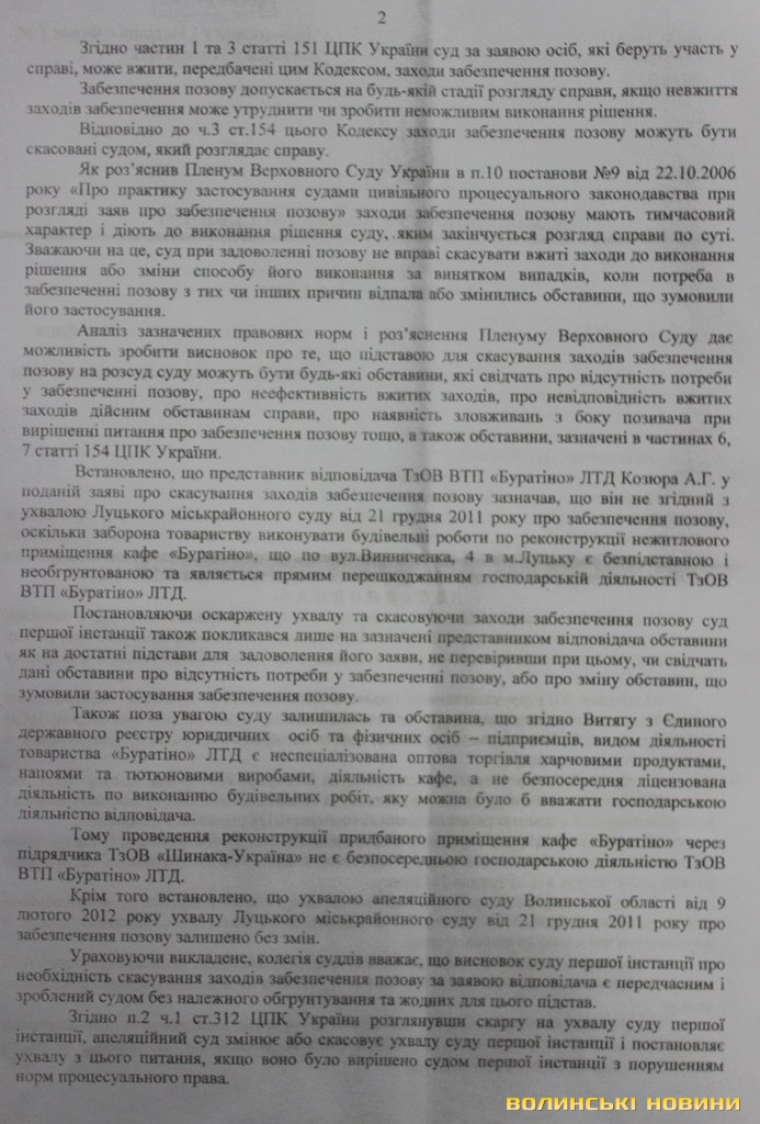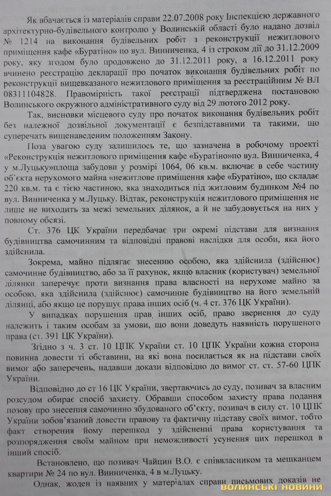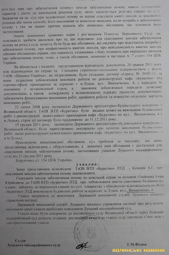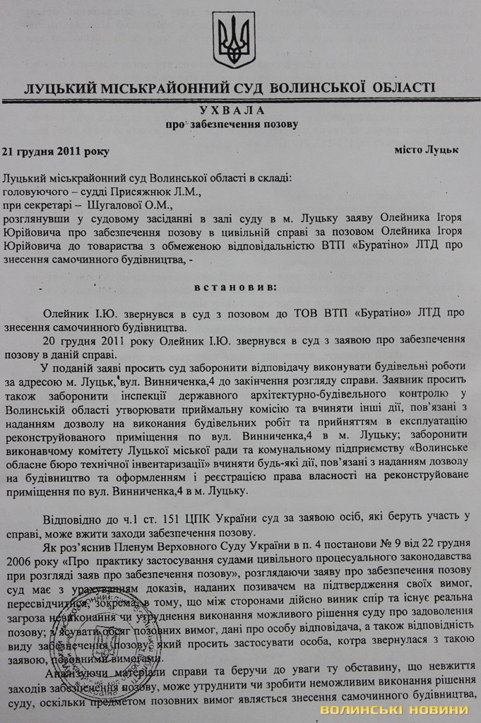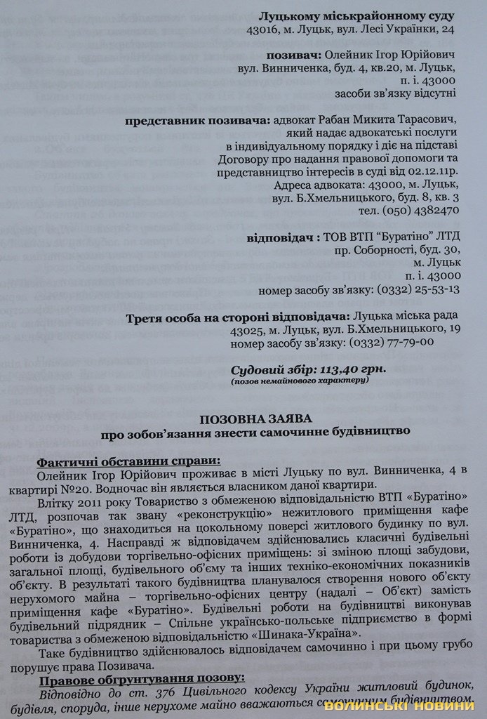 Перша ластівка перемоги у«війні» з мажорами опинилася на боку мешканців. Так, Луцький міськрайонний суд Волинської області 21 грудня 2011-го року за участю головуючого судді Присяжнюка Л.М. постановив призупинити будівництво «Буратіно», допоки справа не буде досліджена.Однак один із співініціаторів бізнесу Андрій Козюра одразу звернувся в суд, аби оскаржити таке рішення. Відповідь не довелося довго чекати: уже 28-го грудня Луцький міжрайонний суд за участю головуючого судді Філюк Т.М. вирішив скасувати попереднє рішення суду.Натомість мешканці будинку Винниченка, 4 знову почали шукати правди у суді, цього разу - в апеляційному. Феміда стала на бік мешканців й Ухвала іменем України від 06 березня 2012-го року задовольнила їх скаргу.Потому лучани підняли питання про знесення об’єкта самочинного будівництва. Як наслідок, Луцький міськрайонний суд за участю головуючого судді Кихтюка Р.М. 14-го вересня вирішив зобов’язати бізнесменів за власний рахунок знести самочинно збудовані приміщення, добудовані до нежитлового приміщення кафе «Буратіно».Втім, попри усі ухвали, торговий центр продовжували будувати, а Андрій Козюра, не бажаючи припиняти бізне, звернувся зі скаргою в Апеляційний суд Волинської області. Цього разу феміда підтримала бізнесмена й скасувала попередні «неприємні» рішення, остаточно ставши на бік підприємців.