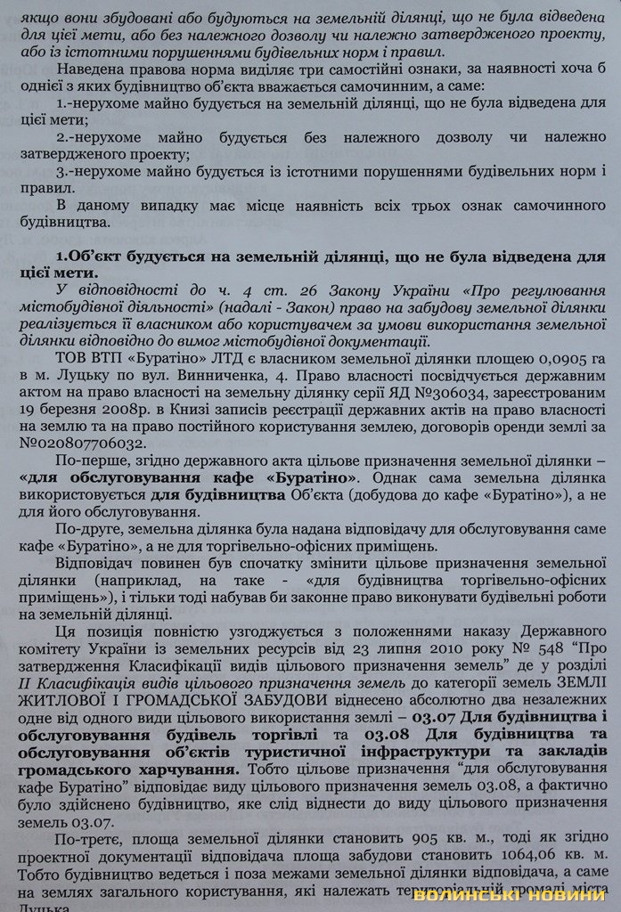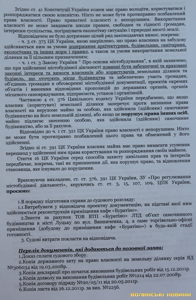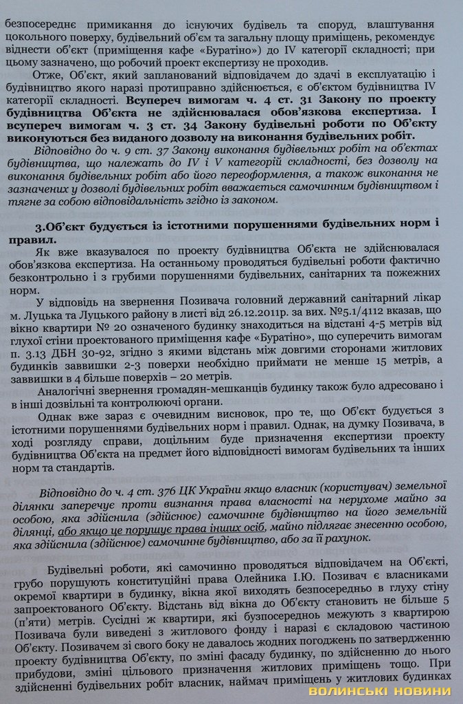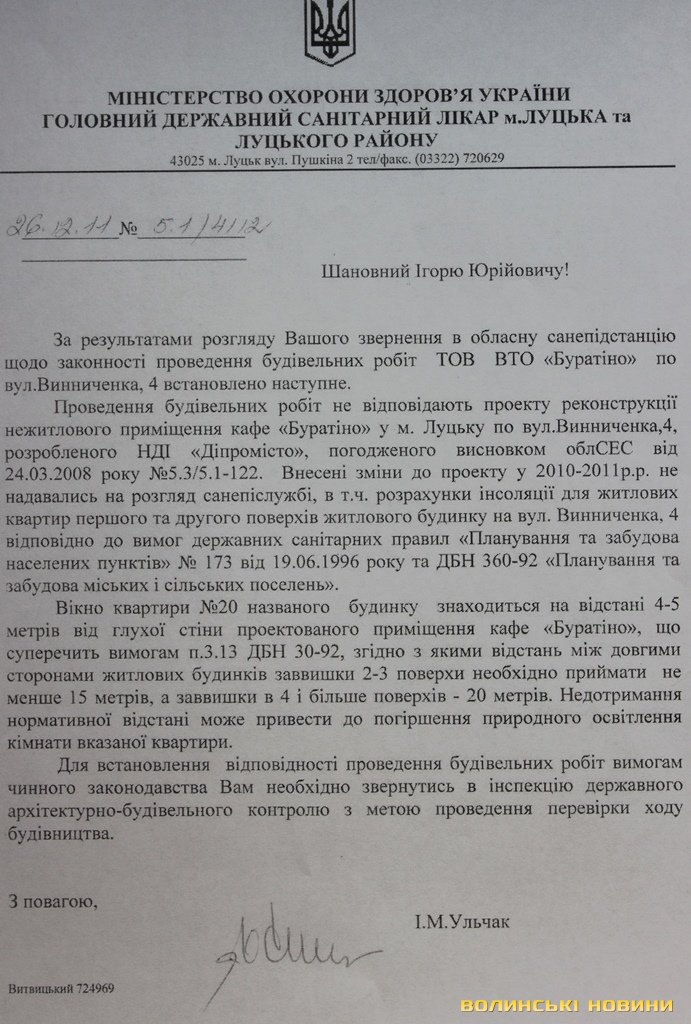 Мешканець будинку Ігор Юрійович звернувся зі скаргою щодо незаконного будівництва в санепідемстанцію. Його побоювання підтвердили. Лист-відповід звучала так: «За результатами розгляду Вашого звернення в обласну санепідемстанцію щодо законності проведення будівельних робіт ТОВ ВТО «Буратіно» на вулиці Винниченка, 4 встановлено, що будівельні роботи не відповідають проекту реконструкції нежитлового приміщення від 24.03.2008-го року, яке погоджене висновком СЕС. Внесені зміни до проекту в 2010-2011–х роках не надавались на розгляд санепідемстанції. Вікно квартири №20 знаходиться на відстані 4-5 метрів від глухої стіни проектованого приміщення, що суперечить вимогам п.3.13 ДБН 30-92, згідно з яким відстань має бути не менше 15 метрів».Будівництво набирало все більшого громадського резонансу. Депутат міськради Святослав Боруцький вирішив розібратися з нашумівшим питанням й звернувся до обранців громади під час сесії Луцькради в грудні 2011-го року, аби перевірити будівництво торгового центру щодо законності. Втім більшість «закрили на це очі».