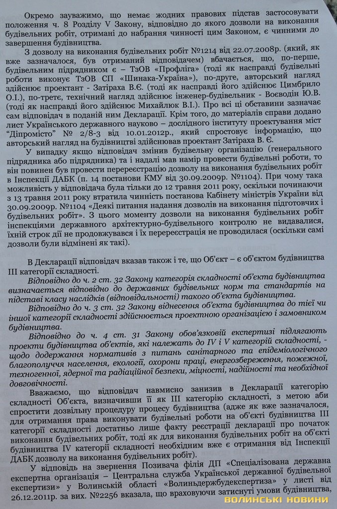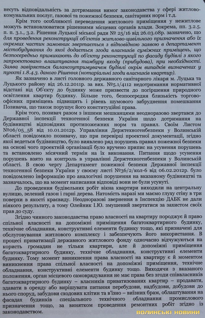 Мешканці цього будинку почали нарікати, що будівництво ведеться з численними порушеннями: замість реконструкції відбувається будівництво, роботи проводять згідно з проектом, який не затверджений належними інстанціями, окрім того, забудовують земельну ділянку, яка для цього не призначена. Лучани звернулися до суду, аби такі роботи були припинені.