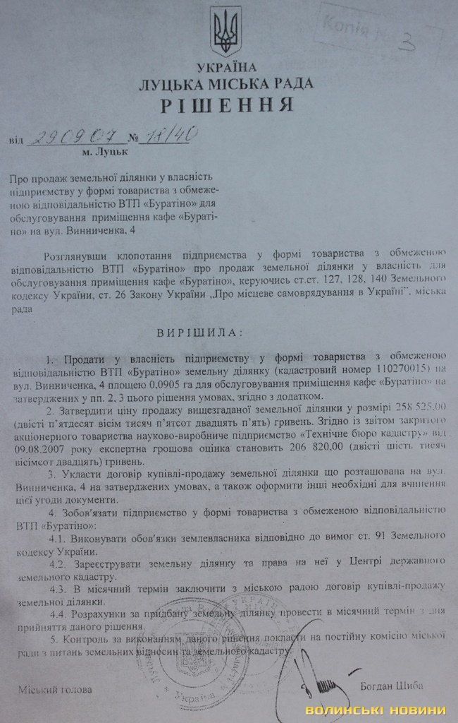 Окрім того, цікаву оборудку спритні бізнесмени зробили із землею. «Ласий шматок» біля «Буратіно» в центрі Луцька оцінило управління земельних ресурсів міста від 05.10.2005-го року в більше як півмільйона гривень. Через два роки, коли її купували лобійовані герої, раптом земля подешевшала вдвічі, й, згідно з договором, її продали за 258 тисяч.Зауважимо, що в документі сказано: «продаж земельної ділянки у власність для обслуговування приміщення кафе «Буратіно».