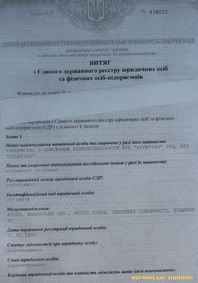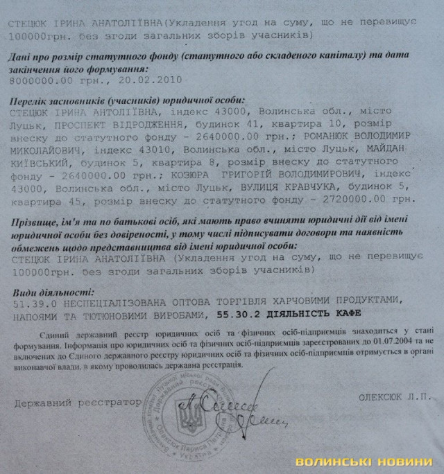 Так, 21.02.1996 року була створена й зареєстрована юридична особа - товариство з обмеженою відповідальністю ВТП «Буратіно» ЛТД.Його засновниками стали: Володимир Романюк, який є сином чинного мера, та його друзі - тато депутата Луцької міськради Андрія Козюри та Ірина Стецюк – дружина бізнесмена Сергія Були.Нагадаємо, на цьому місці у радянські часи було два дитячих кафетерії, які нові власники обіцяли "підремонтувати".