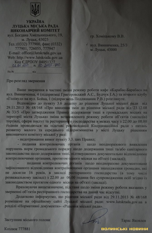 Однак вирішили добитися справедливості у межах правового поля й знову по колу почалося «листування»: Луцькрада дала чергову відписку. До рук незадоволених мешканців будинку вона потрапила лише цього тижня. Згідно із відпискою, підстав для зміни режиму роботи закладу у міськраді не вбачають.Лучан однак така відповідь не задовольнила, тож з проблемою, яка вже набила "оскому" вони звернулися до прокуратури - як до органу, який здатен відстояти їх права. У разі відсутності реакції пригрозили звертатися до ЗМІ та голови облдержадміністрації.