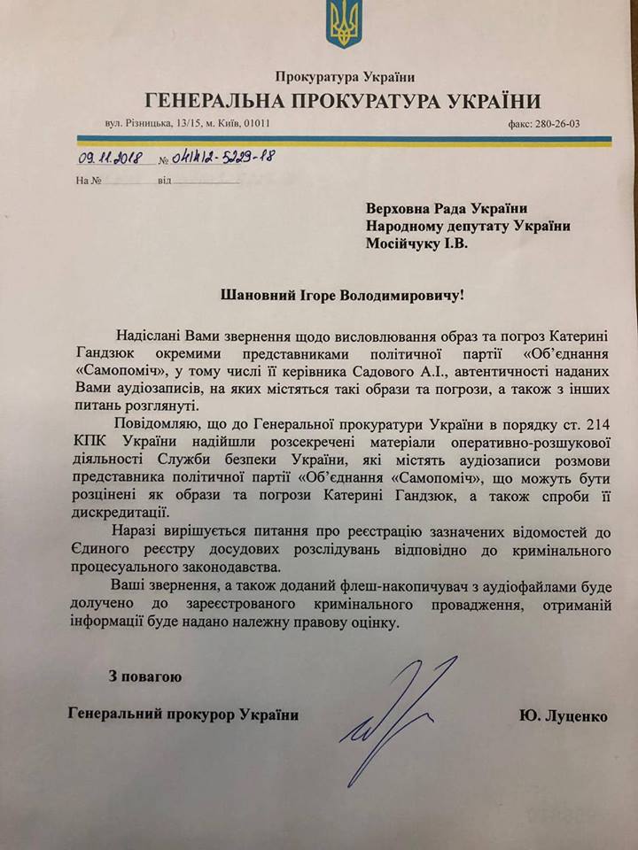 Опрацювавши аудіозапис, ГПУ відповіла на звернення Мосійчука, підтвердивши його автентичність. Генпрокуратура встановила, що на аудіофайлі дійсно говорить Андрій Садовий, а його слова можна розцінити, як образи та погрози Катерині Гандзюк.В Генпрокуратурі також повідомили, що наразі вирішується питання про реєстрацію зазначених відомостей до Єдиного реєстру досудових розслідувань відповідно до кримінального процесуального законодавства.