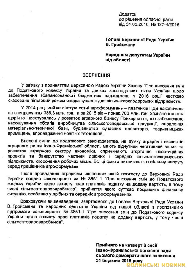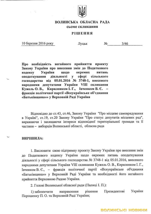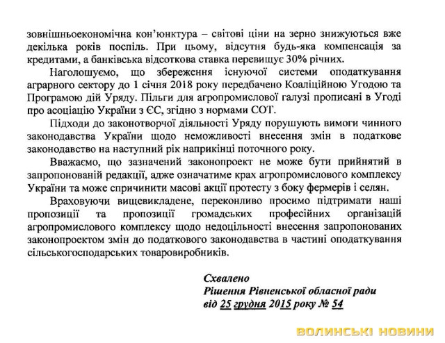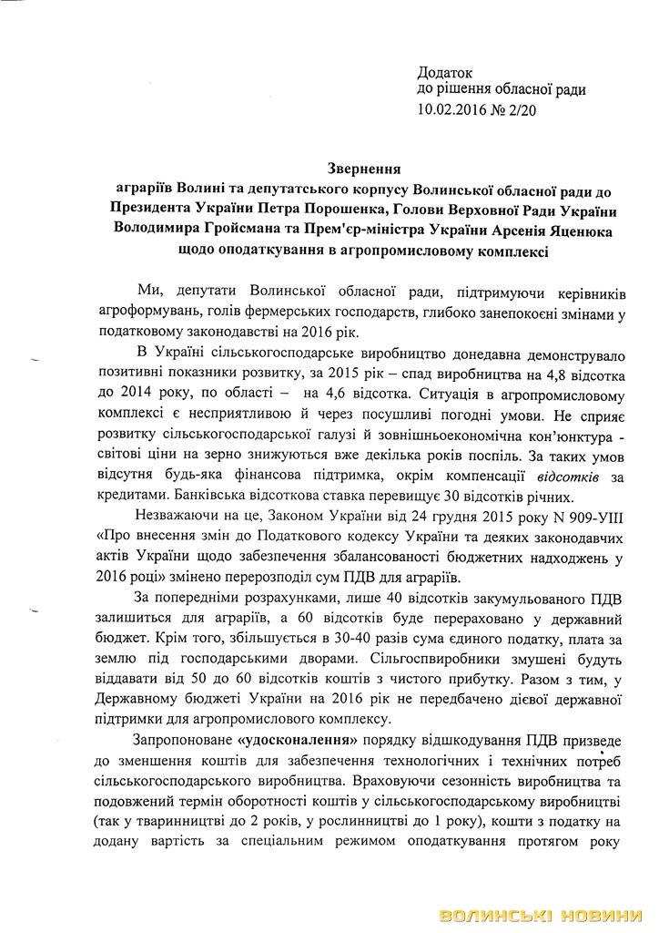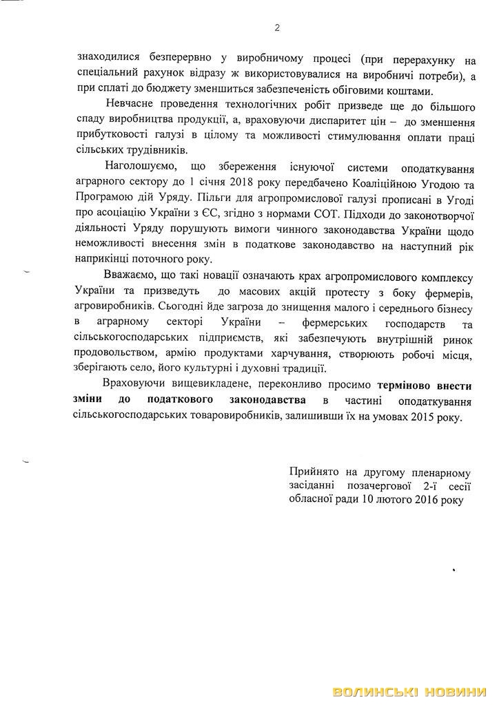 У лютому 2016 року депутати Волинської обласної ради прийняли звернення до Верховної ради України та Кабінету Міністрів з проханням внести зміни до податкового кодексу в частині підтримки аграрного бізнесу. Але відповідь на це звернення на Волинь досі не надійшла.А у квітні до Волинської обласної ради надійшли аналогічні звернення від Рівненської та Івано-Франківської обласних рад, які просять їх підтримати. Регіони, в яких значна частина виробників працюють в аграрному секторі, відверто непокояться. Тож на чергове засідання сесії облради винесені проекти рішень щодо підтримки згаданих звернень. Адже нинішній податковий кодекс, якщо його не змінити, зажене у тінь агарний бізнес.