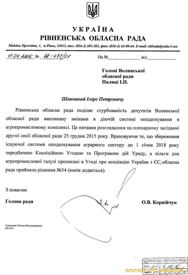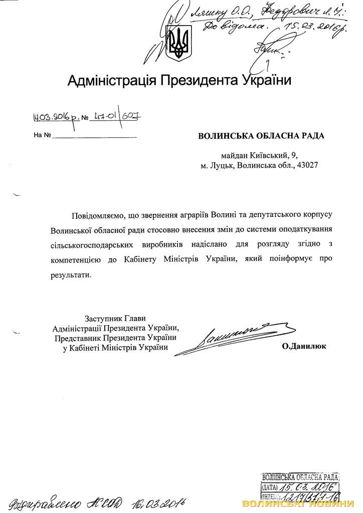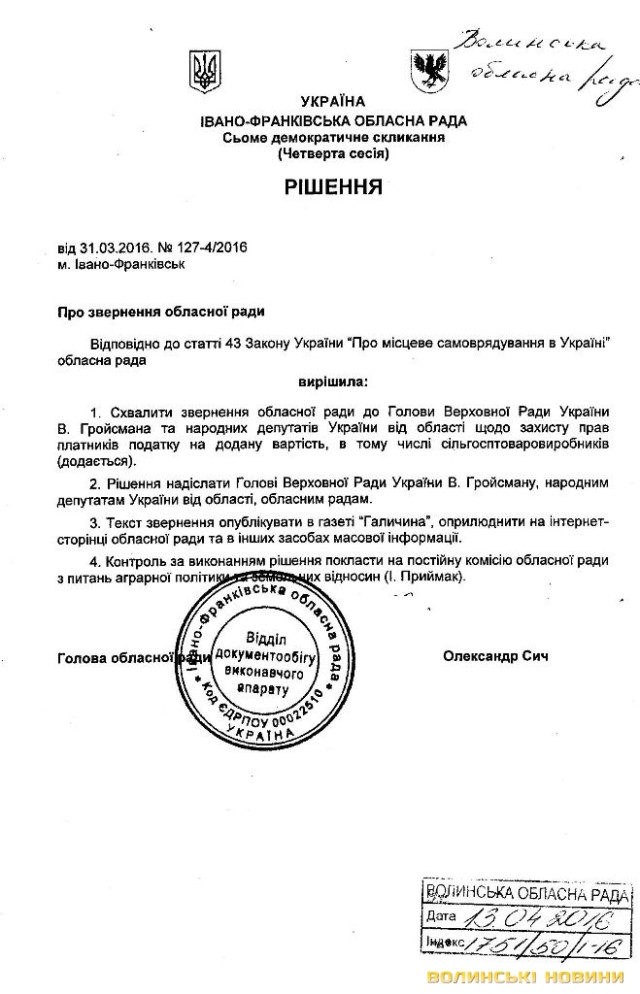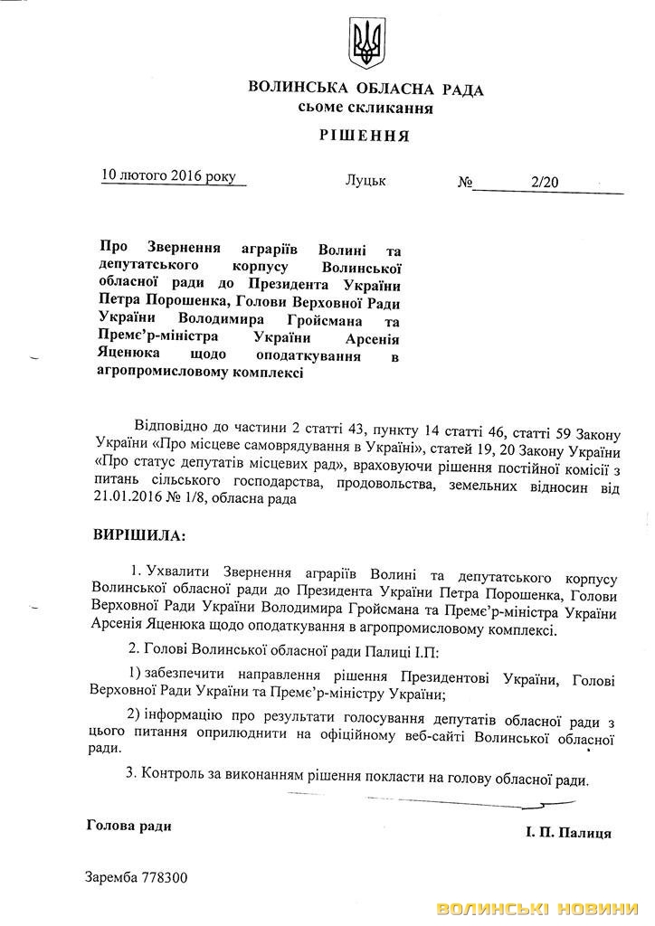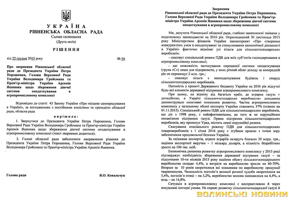 У лютому 2016 року депутати Волинської обласної ради прийняли звернення до Верховної ради України та Кабінету Міністрів з проханням внести зміни до податкового кодексу в частині підтримки аграрного бізнесу. Але відповідь на це звернення на Волинь досі не надійшла.А у квітні до Волинської обласної ради надійшли аналогічні звернення від Рівненської та Івано-Франківської обласних рад, які просять їх підтримати. Регіони, в яких значна частина виробників працюють в аграрному секторі, відверто непокояться. Тож на чергове засідання сесії облради винесені проекти рішень щодо підтримки згаданих звернень. Адже нинішній податковий кодекс, якщо його не змінити, зажене у тінь агарний бізнес.