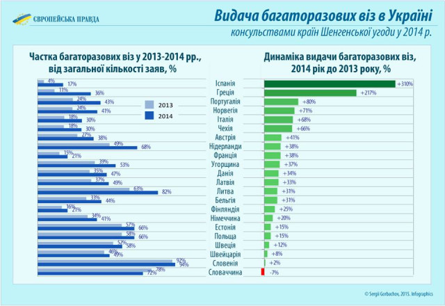 Лідери з темпів зростання показника мультивіз – в основному туристичні країни. Іспанія збільшила його більше ніж в 4 рази, Греція – більше ніж втричі. У Італії, Португалії, Чехії та Норвегії зростання склало від 66% до 80%.