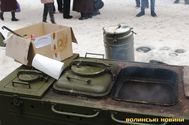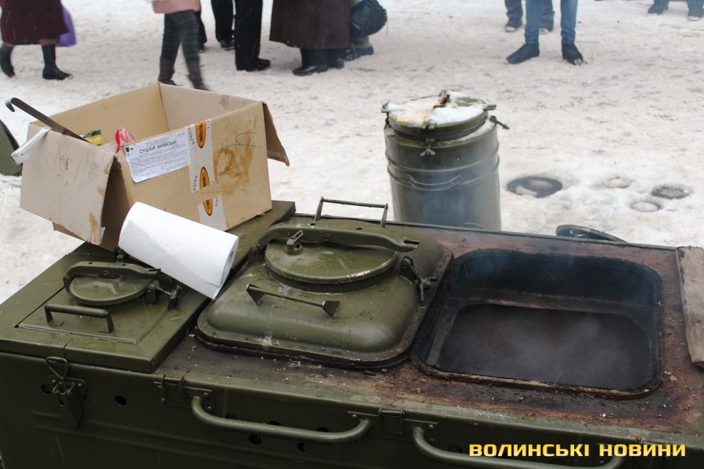 По сусідству з антимайданом, за барикадами, свої намети встановили євромайданівці. Щоб зігрітися, група чоловіків різного віку, грала м’ячем, перехожих та мітингарів частували гарячим чаєм та стравами польової кухні.