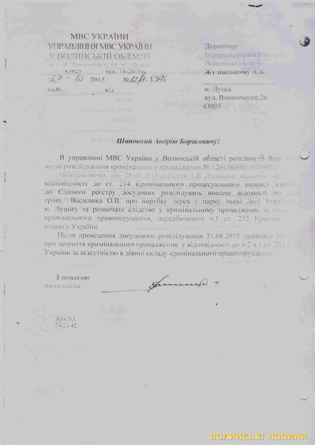 «Коли на місце події приїхали правоохоронці, то вони мене відвели в сторону і сказали, що все відбувається законно, за погодженням мера, - розповідав Олексій Василюк. - Не розумію, до чого тут він? Пізніше у відповідь на заяву мені повідомили, що «в ході проведення перевірки звернення працівники міліції провели бесіду з директором комунального підприємства «Парки та сквери міста Луцька» Трикошем, під час якої звернули увагу на необхідність посилення заходів щодо недопустимості вирубки дерев та чагарників на території парку. Луцька міліція не порушила кримінальне провадження за цим фактом. Вирубка і спалювання дерев не припинилися. При цьому, не були нараховані збитки, а винні у скоєнні порушення не були притягнути до відповідальності».Як запевняв еколог, у зв’язку із незавершеністю адміністративної реформи у галузі охорони довкілля, сьогодні жодна державна установа не має повноважень видавати дозволи на будь-які заходи у заказниках. Пошкодження території заказника підпадає під ст.252 ККУ – «умисне знищення або пошкодження територій, взятих під охорону держави, та об`єктів природно-заповідного фонду».