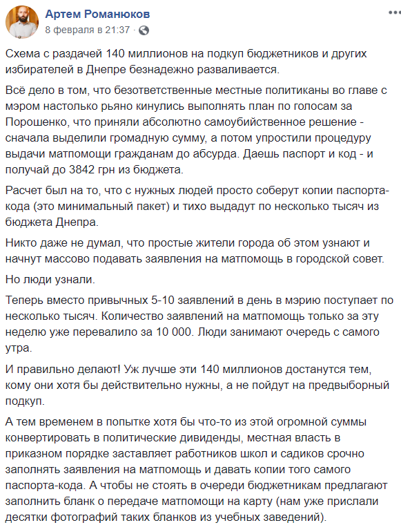 Але що після такого рішення ви, безвідповідальні підлабузники, які за це голосували, скажете тим людям, які з 6 ранку стоять на морозі в чергах за матдопомогою? Або знімете з ремонту шкіл, лікарень і стадіонів ще 140 мільйонів?» – пише Романюків.