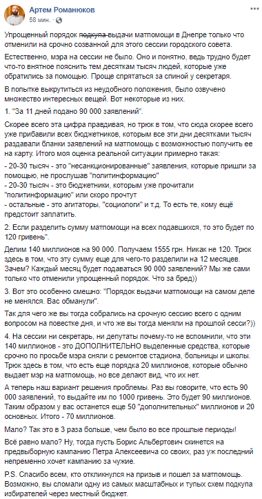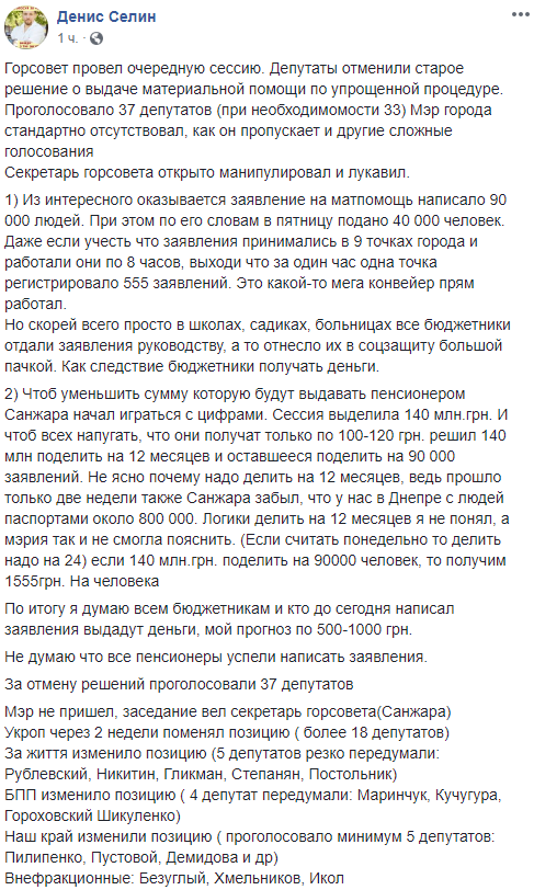 За попереднім рішенням міськрада видавала допомогу будь-якому жителю України, а не тільки Дніпра«, – пише блогер Денис Селін.