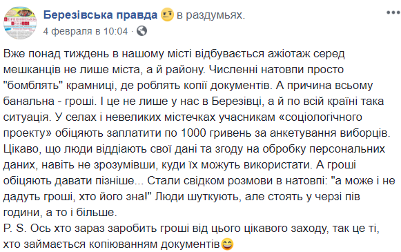 «Більше тижня в нашому місті спостерігається ажіотаж серед жителів не тільки міста, а й району. Натовпи людей просто бомблять магазини з ксерокопіями, де роблять копії документів. І причина банальна. Гроші. І це не тільки у нас в Березівці, а й у всій країні така ситуація. В селах і невеликих містах учасникам «соціального проекту» обіцяють заплатити 1000 гривень за анкету виборців.
