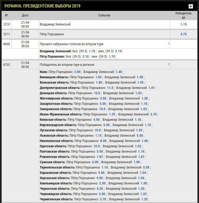 Хоча ще в середу, 10 квітня, йшлося про ставку на чинного президента 3.50. При ставці 100 гривень прибуток становив 250 гривень.
