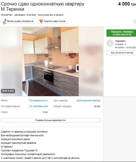 На сайтах оголошень серед справжніх пропозицій трапляються й неймовірно вигідні варіанти з цінами, які в рази нижчі від ринкових. OBOZREVATEL звернувся за вказаними в оголошенні номерами телефону. Трубку взяв хлопець, який не знав ні вартість оренди, ні адреси квартири. «Приїжджайте до нас в агентство для підписання документів, а потім можна поїхати на показ квартири», – розповідає співрозмовник.