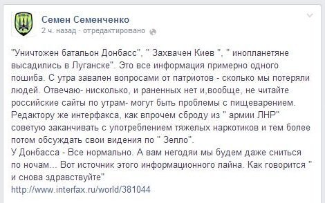 Російські ЗМІ не втомлюються описувати «страшні реалії», які начебто відбуваються на українській землі. «Знищений батальйон Донбас», «Захоплений Київ», «інопланетяни висадилися в Луганську» - фейкові повідомлення такого формату з’являються щодня. Про це повідомив командир батальону «Донбас» Семен Семенченко на своїй сторінці у Фейсбук.