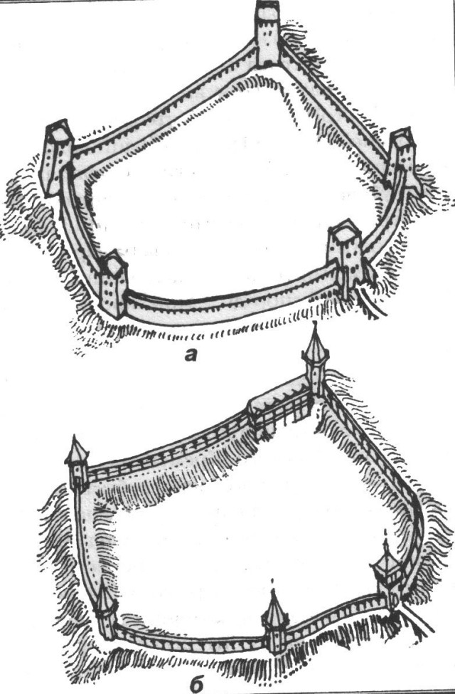 Володимир. Замкові укріплення. Графічна реконструкція П. Ричкова: а-мурований замок 1360-х рр.; б -дерев'яний замок середини XVI ст.