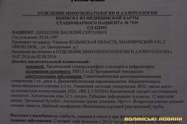 У Василя Шишолика з села Прилісного Маневицького району – хронічний гломерулонефрит. Хлопцеві потрібна термінова трансплантація нирки. Білоруські медики погодилися провести операцію й чекають на донора. Батьки як донори не підходять, адже у них інша група крові.