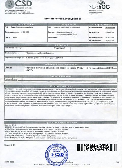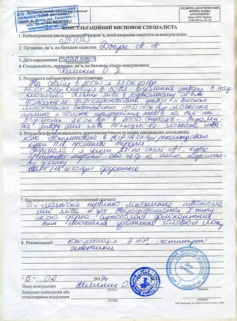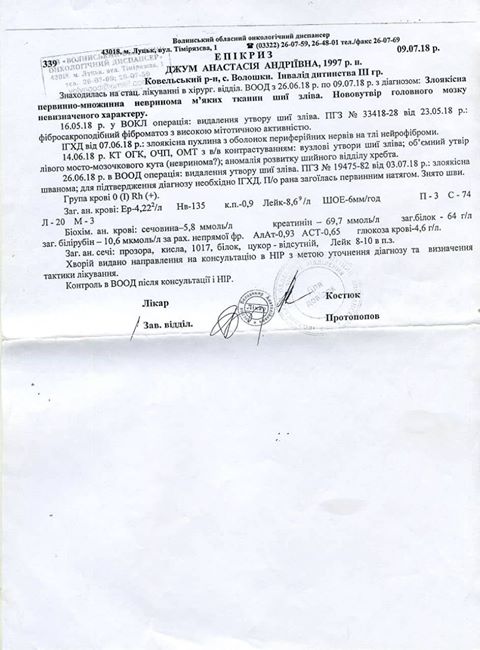 «Ми три рази були в Києві в інституті раку і інституті нейрохірургії . В інституті нейрохірургії в мене виявили пухлину в головному мозку, а біля неї багато новоутворень.Сказали, чим швидше потрібна операція. У Львові в інституті генетики дали три місяці відпочинку. Зараз потрібні кошти на комп’ютерну діагностику з контрастом на все тіло і МРТ з контрастом головного мозку і подальше лікування», – розповідає дівчина.