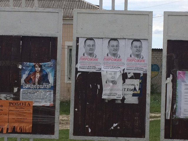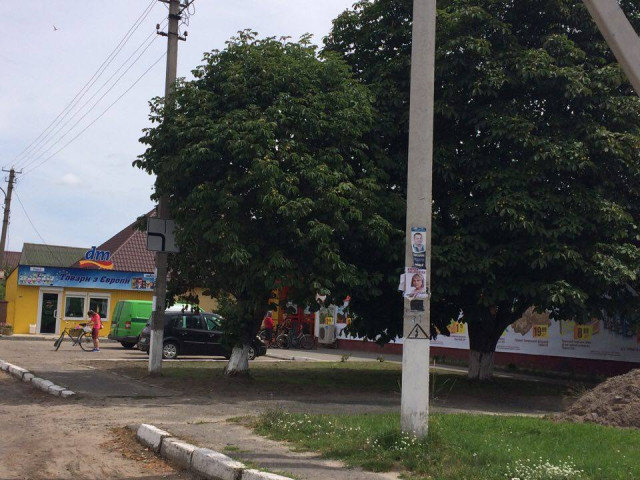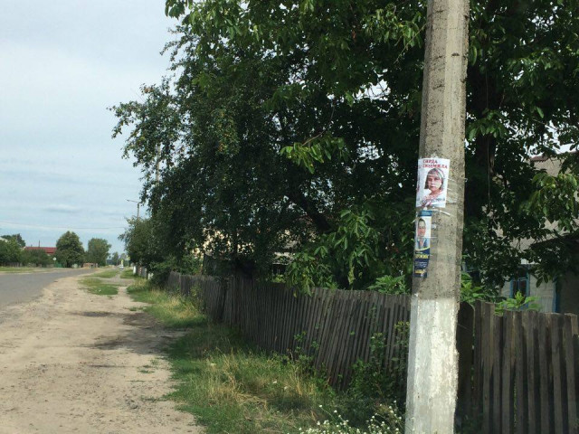 У селищі Любешів агітка Кирди – на дошці оголошень, дверях музичної школи, а на вулиці Свободи – її плакати та плакати Пирожика практично на кожному стовпі.