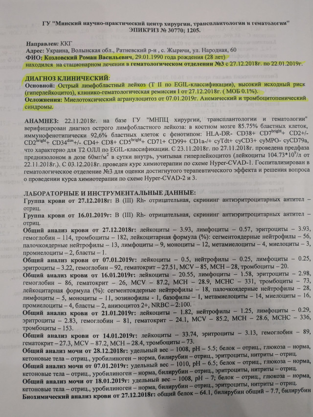 «Захворів в жовтні 2018 року,раптово піднялась висока температура 40.1, нудота, погане самопочуття, потрапив в Ратнівську лікарню, лікували як отруєння. Після здачі всіх аналізів скерували в Луцьк, де поставили діагноз гострий лімфобластний лейкоз.