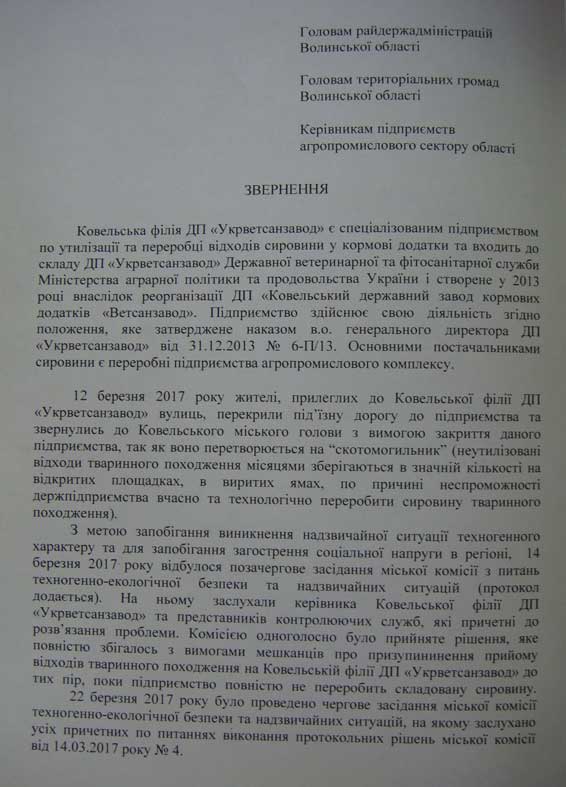 Як повідомляло Інформаційне агентство Волинські Новини, у Ковелі через ветсанзавод склалася ситуація SOS: останнім часом завод не працює, а мертвеччину везуть і вдень, і вночі. Її не переробляють, а скидають або на території заводу, або в яму, або просто у величезні купи. А все це потрапляє у ґрунтові води, які йдуть по всьому місту. Люди б'ють на сполох.