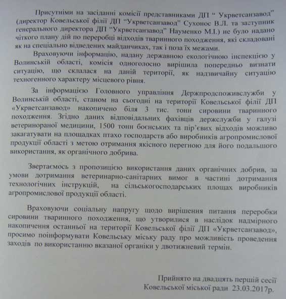 Після того як інші філії ДП «Укрветсанзавод» не захотіли забирати з Ковельського підприємства відходи тваринного походження, яких там накопичилося біля 3 тисяч тонн, а також після невдалої затії регіональної комісії з питань техногенно-екологічної безпеки та надзвичайних ситуацій під керівництвом голови ВОДА Володимира Гунчика закопати трупні відходи неподалік села Старі Кошари Ковельського району, місцеві депутати за черговим рішенням тієї ж таки обласної комісії взялися шукати підходящу земельну ділянку вже на території міста, повідомляє ПроКовель.