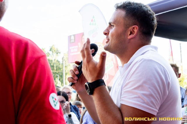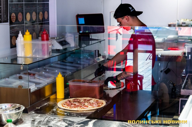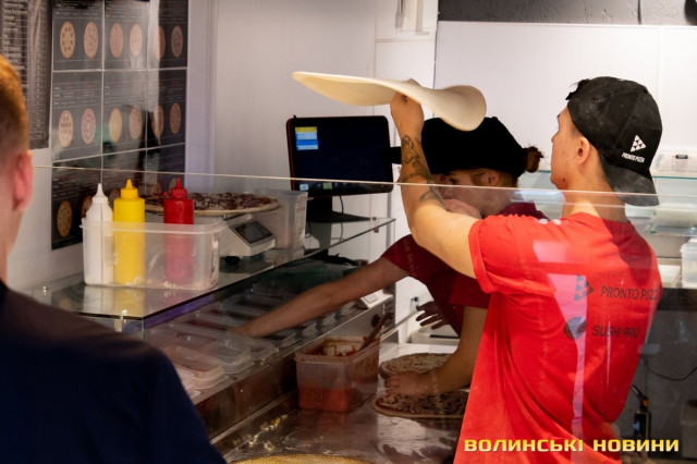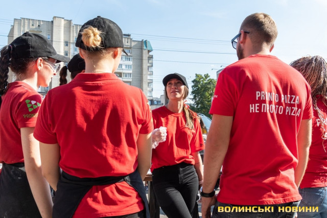 Вже опівдні тут кипіла робота: усі, від офіціантів і до керівництва, готували інгредієнти, облаштовували місце для випікання найдовшої в Луцьку піци, запрошували лучан завітати на дегустацію.З-поміж працівників ми не одразу й помітили засновника мережі піцерій Pronto Pizza з Івано-Франківська Миколу Федеркевича. Бо чоловік не очолював процес, а був його безпосереднім учасником: разом з офіціантами носив столи та стільці, згодом налаштовував спеціальну конвеєрну піч, яка мала працювати просто неба.