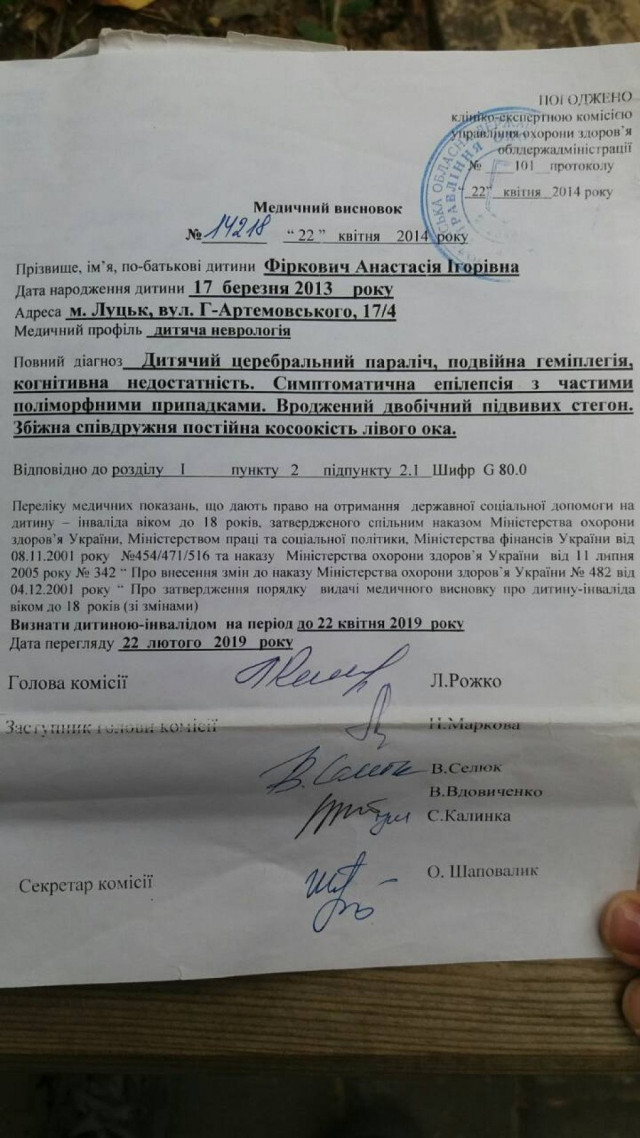 Маленька Настя Фіркович в свої 5 років ще навіть не сидить. Однак, незважаючи на цілий букет діагнозів (ДЦП, епiлепсiя з частими полiморфними припадками, вроджений двобiчний пiдвивих стегон, постiйна косоокiсть лiвого ока і т.д.), у неї є шанс на нормальне життя.