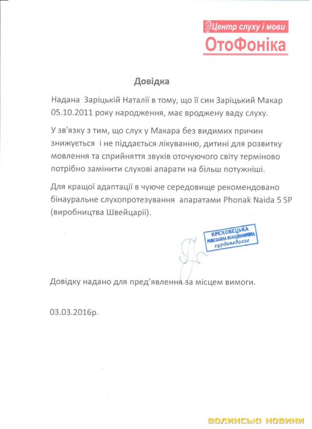 Лучанин Макар Заріцький не чує з народження. У 2013 році йому поставили попередній діагноз туговухість II-IIIстепенів. Тоді ж батьки придбали йому перші слухові апарати. У 5 років, після огляду спеціалістами львівської клініки «Отофоніка», лікарі поставили черговий діагноз - нейросенсорна туговухість IVстепеню. Наявні слухові апарати виявилися занадто слабкими і втратили свою функціональність.