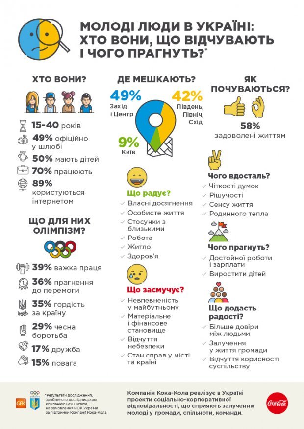 Масштабне соціальне дослідження "Оцінка українською молоддю власного добробуту" ініціював Національний олімпійський комітет України в рамках проекту Olympic moves UA, який він здійснює разом з Кока-Кола. Організаторам важливо було зрозуміти, чим насправді живе сучасна українська молодь, до чого прагне, що робить її щасливішою.