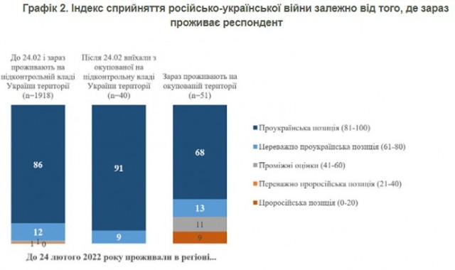 За словами соціологів, також важливо бачити, що серед респондентів, які зараз проживають на окупованих територіях, 81% дотримуються переважно або цілком проукраїнських позицій (в т.ч. 68% дотримуються цілком проукраїнських позицій). А проросійських позицій дотримуються лише 9%.Водночас практично всі респонденти, які виїхали з окупованих територій, дотримуються саме проукраїнських поглядів.