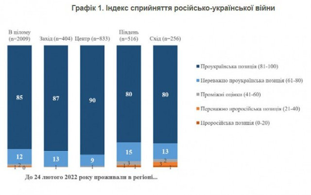 Соціологи відзначають, що у 7 з 8 випадків не менше 85% респондентів стверджували, що поділяють саме проукраїнську позицію. У цих же парах не більше 8-9% дотримувалися проросійської інтерпретації.