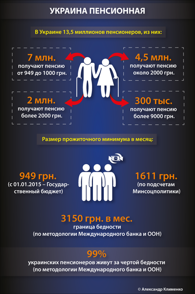 «Міжнародний банк і ООН визначають межу бідності на рівні 3150 гривень на місяць (5 доларів на день). Якщо керуватися їх методологією, то 99% українських пенсіонерів живуть за межею бідності», – зазначає Клименко.