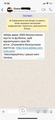 У всьому світі набирає обертів нова схема шахрайства. Жителям різних країн надсилають у месенджерах новину про те, що компанія Adidas нібито проводить акцію і безкоштовно роздає взуття. Щоб отримати подарунок, шахраї пропонують перейти за посиланням у повідомленні.