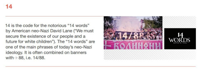 У наочний посібник FARE внесла й фанатів луцької «Волині», як приклад заборони на комбінацію цифр «14/88». Зазначимо, згідно тлумачення символів FARE число «14» означає 14 слів Девіда Лейна (відомого неонацистського діяча), а «88» - абревіатуру «НН», що означає «Heil Hitler».