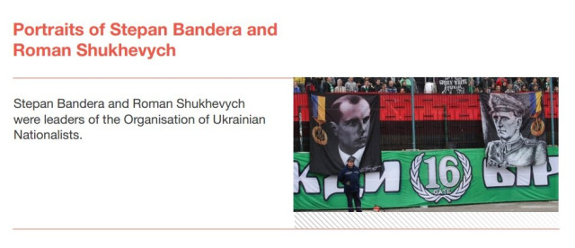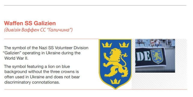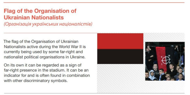Цікаво, у виданні є цілий розділ зі символікою українських націоналістів. Згідно поглядів FARE їм теж не місце на стадіонах. Так, організація забороняє червоно-чорний прапор, герб дивізії СС «Галичина», портрети Степана Бандери та Романа Шухевича і символ «Ідея нації».
