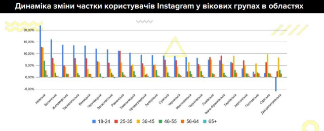 Друге місце за популярністю серед молоді займає Instagram – соцмережею користується 9,6 млн українців віком від 18 до 34 років. Зазначається, що за останні півроку Instagram збільшив кількість користувачів серед українців віком від 13 років на 2,3 млн, вперше випередивши у цій категорії Facebook.Аудиторія Instagram в Україні становить 17,3 мільйона користувачів, що на півмільйона більше, ніж у Facebook – 16,8 млн.